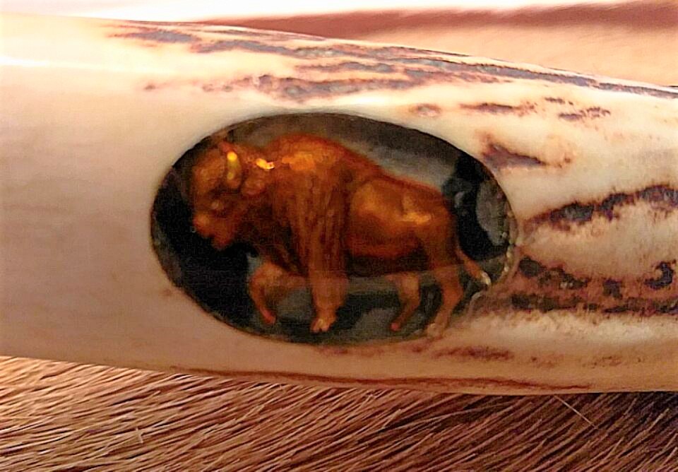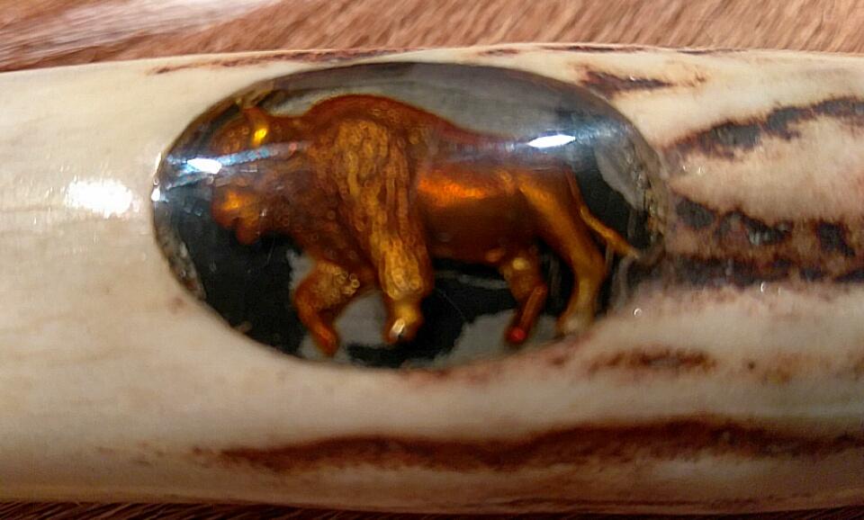 This example has an Original Pure Alaskan Gold Bison Carved by Leschorn set into the handle!